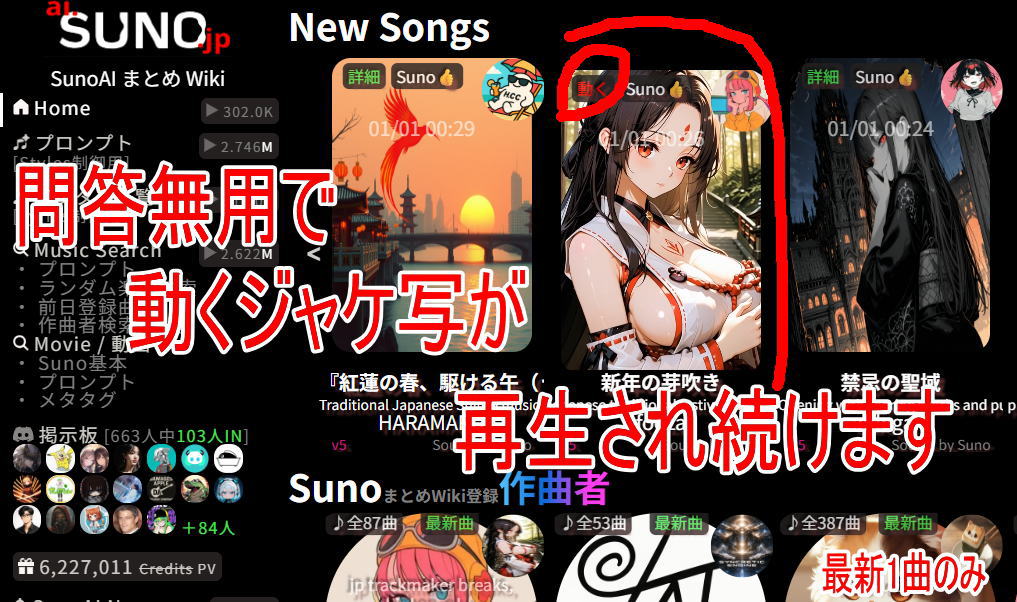 通常は、マウスオーバーやクリックで動きますが、最新登録の動くジャケ写採用の1曲は自動再生されます (NewSongs + 特定の企画枠限定)