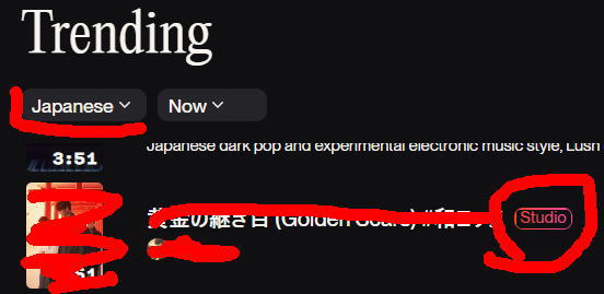 studio利用曲は、Japanese等の「地域Trending」対象外でしたが、各国のTrendingに掲載されるように仕様変更されたようです。これにより、全力制作の楽曲が、多くの方の目にとまります。\(^o^)/