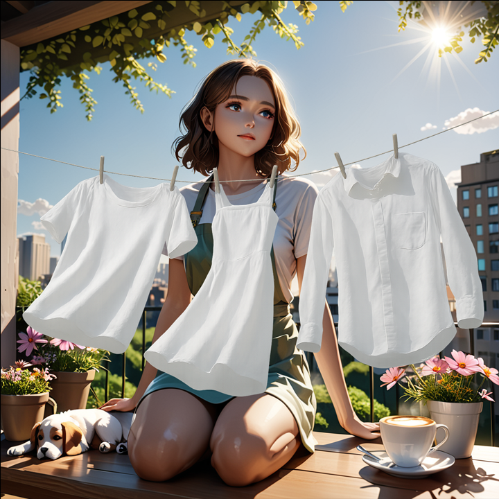 :Lo-fi bossa nova latina song with bilingual lyrics (Spanish u0026 Japanese). Female vocal slightly husky warm and natural expression front in the mix. Gentle acoustic guitar soft Latin percussion brushed drums subtle jazz bass. Afternoon sunlight atmosphere breeze through hanging laundry cozy garden vibe. Warm analog tone natural reverb soft vinyl texture. Playful rhythm but calm mood cinematic lo-fi mix with romantic and everyday charm. BPM 85 style inspired by modern bossa nova and lo-fi cafe tunes. Includes an 8-bar instrumental interlude between Verse 1 and Verse 2 featuring acoustic guitar and percussion.