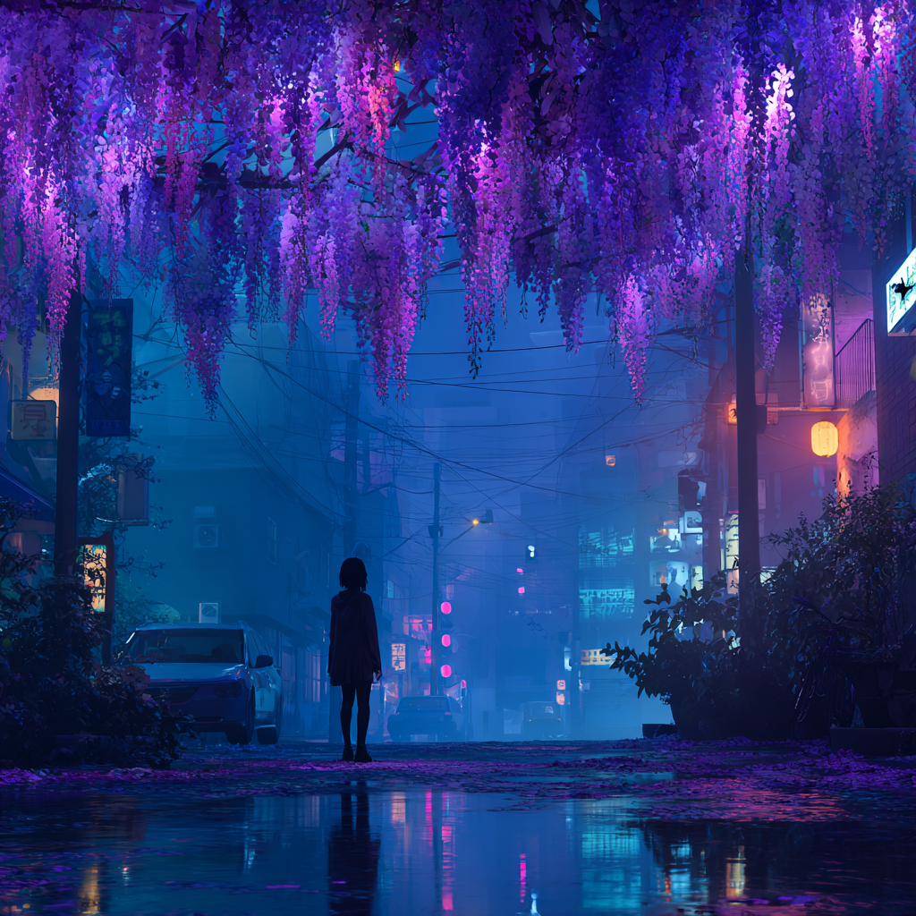 | Wisteria in the Rain (Still I Bloom) 歌詞欄(Lyrics)[Verse 1] Blue reflections on the street Echoes hum beneath my feet. Wisteria falls in the midnight air Whispers of what once was there. [Pre-Chorus] Your shadow fades in the neon glow Raindrops tell the things I know. [Chorus] Purple rain it softens the pain Washing away what I can’t explain. Even as the petals fall I bloom again — through it all. [Verse 2] Umbrella lost in the sleepless night Memories blur in the city light. Every step a silent prayer For what we had still lingers there. [Pre-Chorus] If I call your name again Will it echo in the rain? [Chorus] Purple rain it softens the pain Holding the dream we couldn’t sustain. Wisteria sways still I bloom Finding light in the quiet gloom. [Bridge] (English-Japanese mix) Neon rain whisper my name Lost in blue chasing the flame. 紫の夜に揺れながら — Still I bloom though you’re gone far. [Final Chorus] Purple rain rewriting time Turning my tears into lines. Wisteria drifts dissolving slow But in my heart — you still glow. |