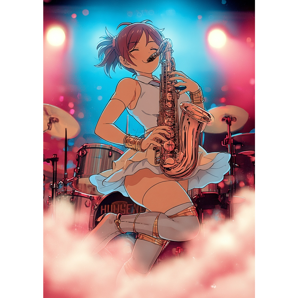 :A powerful drum'n'bass track infused with live jazz energy. Furious breakbeats and deep rolling basslines drive the rhythm while a wild emotional saxophone blows fiercely over the chaos. Include intense drum solos with complex fills and improvisation giving a live performance feel. Raw cinematic and high-energy — like a jazz band losing control inside a DnB club. Dynamic shifts between quiet tension and explosive release full of sweat and adrenaline.