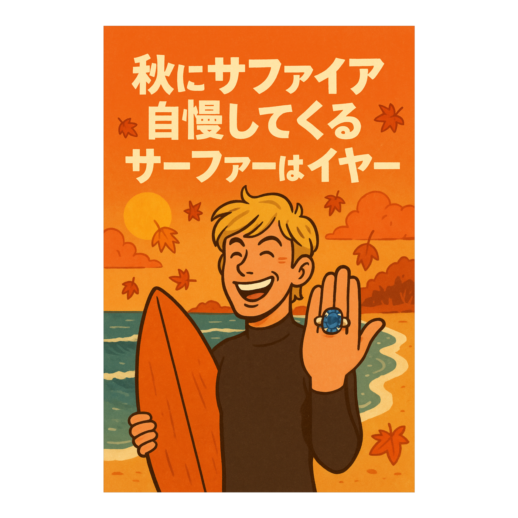 秋にサファイア自慢してくるサーファーはイヤー 歌詞欄(Lyrics)[Intro] 秋の海風 ちょい冷たいやん 波も気まぐれ 心もしぶき --- [Verse 1] 砂に残った サーフボードの跡 夏の名残が まだチラリ見える 焼けた笑顔で また来たサーファー サファイア光らせ ドヤ顔イヤー --- [Chorus] 秋にサファイア 自慢してくる サーファーなんか ちょい寒いやん 海も空も もう落ち着いてる 見せびらかす波 もう引いとるで --- [Verse 2] 風がささやく 季節は変わる 派手なきらめき もういらんのに コート羽織って 見送る背中 まだ夏の夢を 追いかけとるんか --- [Chorus] 秋にサファイア 自慢してくる サーファーなんか ちょい切ないやん 恋も波も 引き際がキレイ 見せびらかすより 染みる青 --- [Bridge] 夕暮れ染まる サファイアブルー もう胸の奥に 沈めときや 煌めきよりも 静かな空 似合う季節を 選べばええやん --- [Final Chorus] 秋にサファイア 自慢してくる サーファーなんか ちょい寂しいやん 波間に映る 過ぎた季節に 笑って手振る 秋の浜辺で --- [Outro] サファイアよりも 空が綺麗や ほなまた夏に 会おうやな |