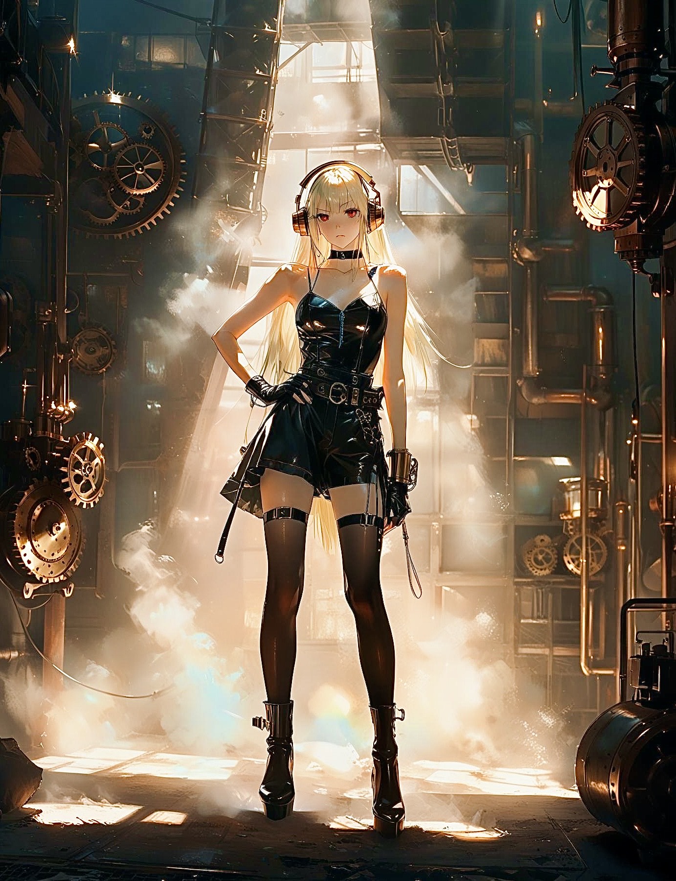 :[RabbitCore: Steampunk Industrial Jazz × Phonk Groove × Funky Slap bass × Mechanical Soundscape] [Mood: Mechanical grace seductive resilience ticking inevitability] [Instruments: Hammer pulse gear synths steam hiss metal clank bass wrench percussion brass sparks sub-brass drone valve burst FX TR-1000 + DrumPad] [Vocals: Husky cool female (main) × Low smoky male rap (“蒸留酒の男”)] [BPM: 96 / sharp rhythm smoky swing clock ticks syncopation] [FX: Steam burst metallic echo clock tick pan reverse brass swell mechanical reverb tail tape saturation sidechain hiss] [Soundscape: Factory ambience × Rhythmic machinery × Layered percussive steam × Low-end industrial resonance] [Mix Focus: Wide stereo metallic spread heavy low-mid body transient snap on snares] [Multilayered direction (#layer-data): Vocal Layers / Bass Layers / FX Layers — creating immersive 3D motion field]