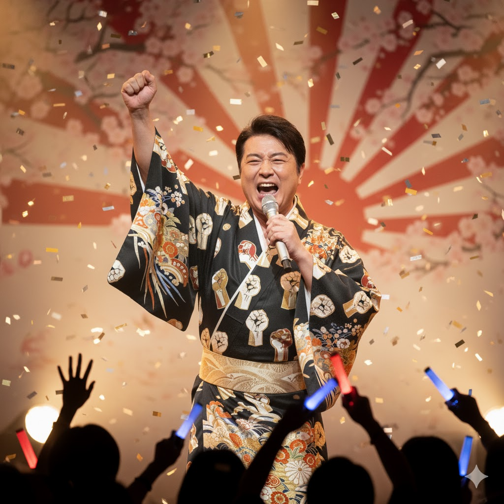 :Style: Traditional Japanese enka vocals with Heavy Hard Rock / Groove Metal instruments Tempo:140 BPM (maintain this tempo throughout the entire track) Tuning:Drop D Key:E minor Vocals: Strong kobushi powerful male vocals kobushi singing melismatic ornamentation wide expressive vibrato pitch bends slides long sustained notes dynamic vocal control emotional dramatic guitar_tone=distorted crunchy heavy drum_pattern=fast double_kick powerful mood=dark angsty dramatic energy=high instrumentation=electric_guitar heavy_drums bass dynamics=dynamic build_up climactic production_style=raw live_feel . Mixing instructions: consistent dynamics: minimize temporal volume changes flat mix: suppress automatic dynamic curve generation balanced loudness: RMS auto-level correction enabled