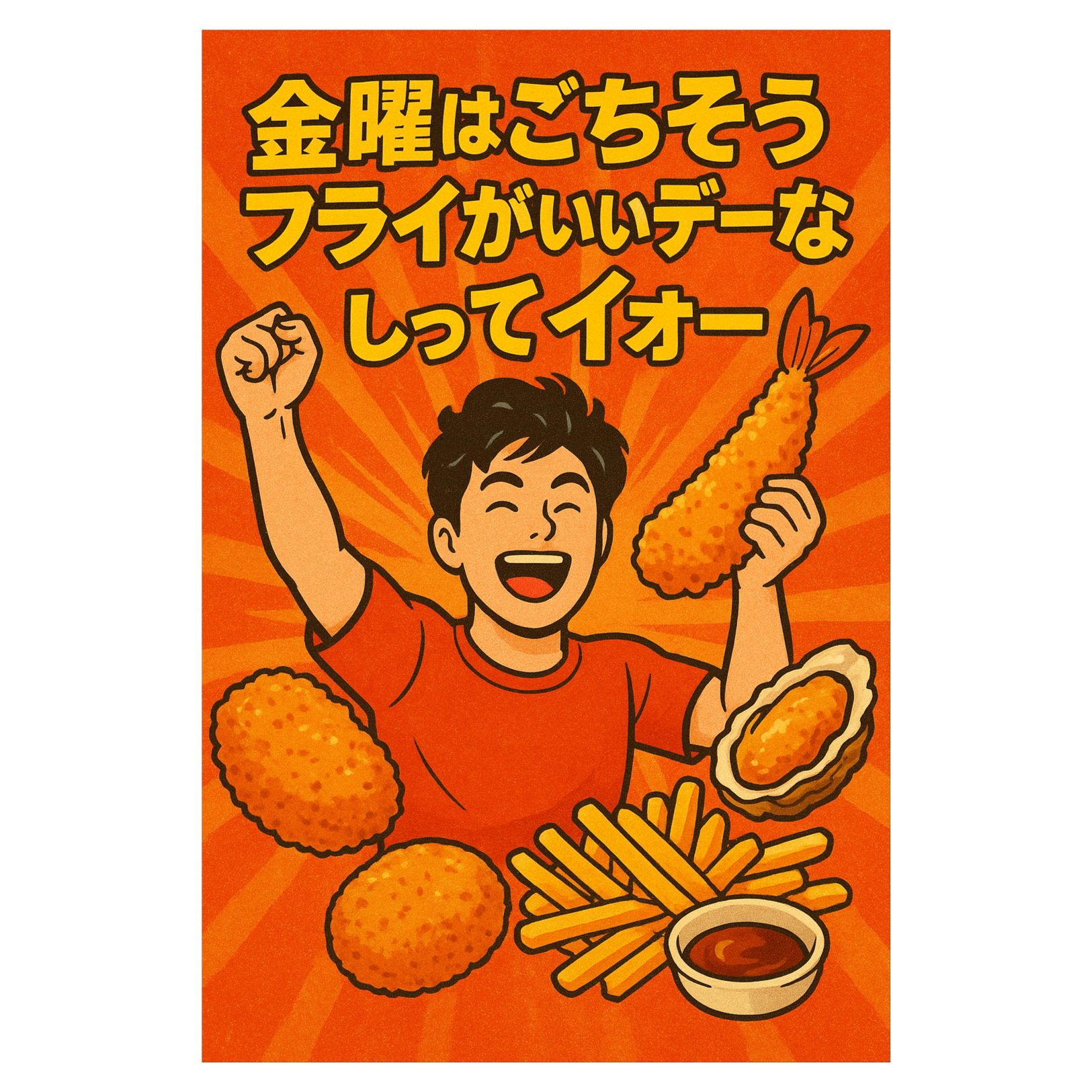金曜はごちそうフライがいいデーなってイオー 歌詞欄(Lyrics)[Intro] イオー!揚げろフライ! 金曜はパーティーや! [Verse 1] 朝からバタバタ働いて 昼には夢見る晩ごはん 金曜チャイム鳴ったらば 揚げ油あたためタイム! [Pre-Chorus] ウキウキ湧いてくるこの感じ 週末ボーナスの香りや! [Chorus] 金曜はごちそうフライが いいデーなってイオー! エビでもカキでもなんでも サクサク幸せデー! [Verse 2] 買い出しカゴにポテトもん マヨもケチャもスタンバイ 家じゅう笑顔で弾けてく 金曜スペシャルナイト! [Pre-Chorus] 明日は休みや もう怖いもんなし 油の海へダイブしよ! [Chorus] 金曜はごちそうフライが いいデーなってイオー! ソースの香りに包まれて 心も満タンデー! [Bridge] ジュワッと響くサウンドが 一週間のエンディング! みんな集まれ 食卓が 今日のライブステージや! [Final Chorus] 金曜はごちそうフライが いいデーなってイオー! 揚げて笑って叫ぼうや 「イオー!フライ最高!」 [Outro] イオー!金曜フライで乾杯! また来週も、揚がってこー! |