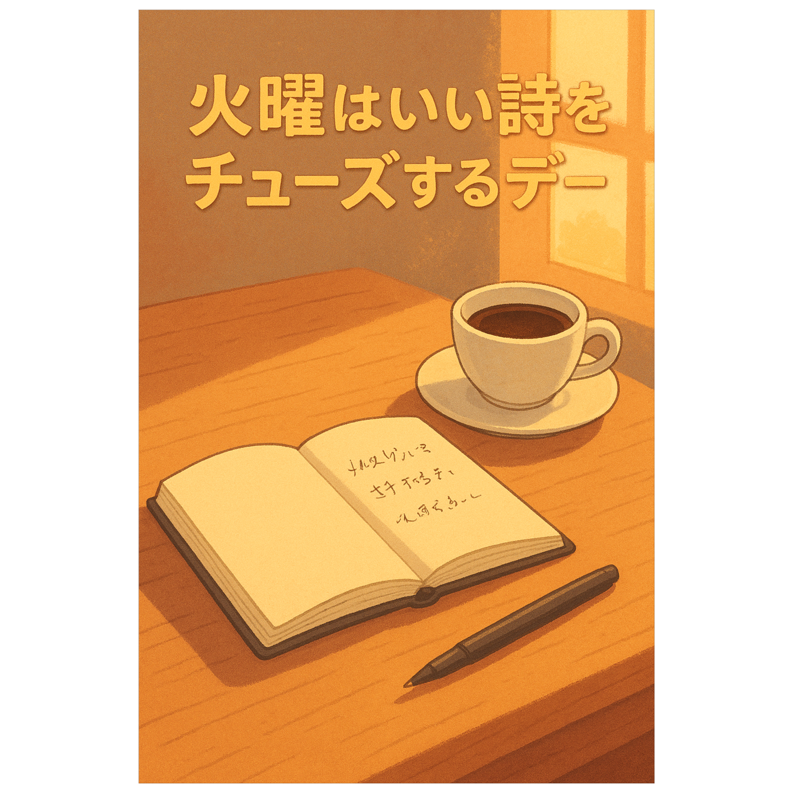 火曜はいい詩をチューズするデー 歌詞欄(Lyrics)[Intro] チューズ チューズ 火曜はチューズ いい詩を探すんやで --- [Verse 1] 朝のカフェで開くノート 昨日の夢がまだ残る 言葉の種をまくみたいに 今日もペンが踊り出す --- [Chorus] 火曜はいい詩をチューズするデー 心のままにリズムで描け メロウな風に想いを乗せて 響け ぼくらのポエムデー --- [Verse 2] 散歩道で拾うフレーズ 街のざわめきも音楽や すこし憂う午後の空に インクの花が咲くようで --- [Chorus] 火曜はいい詩をチューズするデー 迷うことさえ愛しくなるね 音とコトバが寄り添うように 今日も心をチューズして --- [Bridge] ありふれた日々を綴って ちょっと笑って また進む 火曜がくれた この気持ち 詩にして残したい --- [Final Chorus] 火曜はいい詩をチューズするデー 心の奥を照らしてくれる ページの中で君に会えたら それが最高のチューズデー --- [Outro] チューズ チューズ 火曜はチューズ いい詩を選ぶんやで |