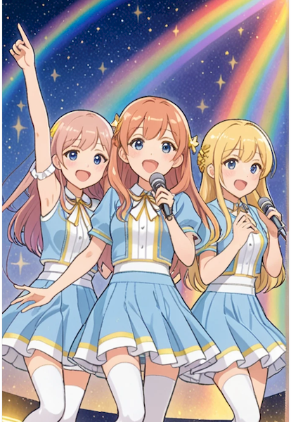 Caption:あなたの『 好き 』を応援します。あなたの尊い情熱と輝きを💖 「 三姉妹物語 」という架空アイドルグループのデビュー曲をイメージした楽曲です。 (中央)長女:芽衣(めい)、(右)次女:葉瑠(はる)、(左)三女:結音(ゆね) この楽曲のテーマは「 骨のサイクル 」ですが、その仕組みの説明ソングではありません。仕組みを部分的に別の表現で歌にしています😁SUNOが3種類用意していた内の[Chorus 3]を全部[Chorus 1]で歌い上げてちょっと悲しい🥲🎵
