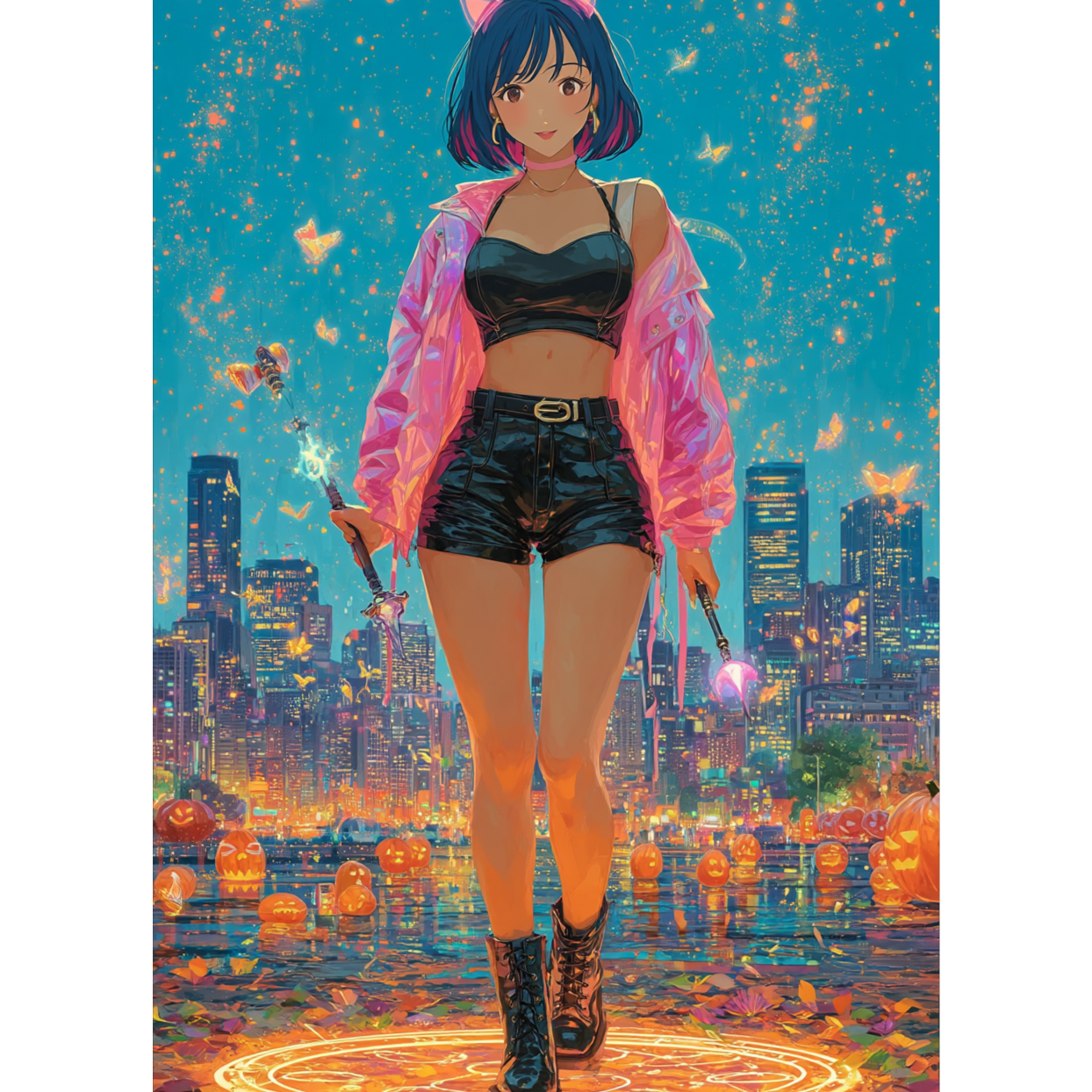 :Hard Jersey Club beat (BPM 138) with aggressive female rap flow and confident energy. Bouncy kick rhythm chopped vocal fills sparkly synth stabs and club-style drum breaks. Theme: a fierce cat-themed magical girl rapper ruling the Halloween night. Vocal: female rapper deep tone confident swagger mix of rhythmic rap and chant hook. Mood: sexy mysterious powerful urban magic. Include chanting spell section with rhyming words like “Lyrica Lumikah Miramira Majika.” Blend Jersey Club bounce with Kawaii fantasy pop synths.