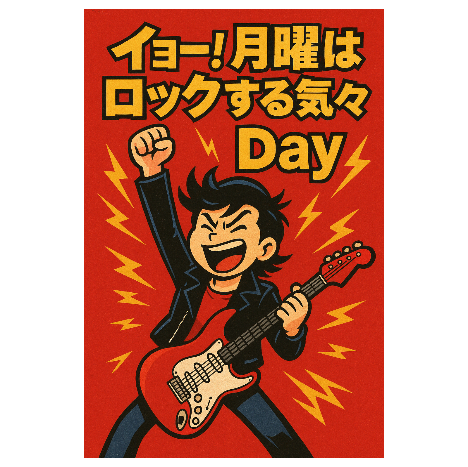 イォー!月曜はロックする気満々Day 歌詞欄(Lyrics)[Intro] イォー!イォー!月曜ロック! 気合いでぶち上げろー! --- [Verse 1] 目覚ましギターが 鳴り響く朝 コーヒーより熱い リフで始動 寝ぐせもステージ セットの一部 誰も止められへん ロック魂! --- [Pre-Chorus] スーツ着てもロックや 通勤路がステージや 胸に火を灯して 「今週もぶち上げろ!」 --- [Chorus] イォー!月曜はロックする気満々Day! ノリで仕事も全部ロール! イォー!ギターかき鳴らせハートで! 退屈なんて吹き飛ばせ! --- [Verse 2] 上司の説教も リズムで回避 コピー機ジャムっても ソロで突破 午後三時テンション 再点火や 魂のコードで繋がれ! --- [Pre-Chorus] 誰もがロッカーや 心の中のステージで 鳴らせ自分の音 響け月曜アンセム! --- [Chorus] イォー!月曜はロックする気満々Day! ノリで仕事も全部ロール! イォー!ギターかき鳴らせハートで! 退屈なんて吹き飛ばせ! --- [Bridge] Woah-oh-oh-oh! 月曜のブルース蹴散らせ! Woah-oh-oh-oh! 今週もブチ上げろ! --- [Final Chorus] イォー!月曜はロックする気満々Day! ノリで世界を巻き込め! イォー!ギターと共に進むで! 今週も全力でGo! --- [Outro] イォー!イォー!ロックMonday! 叫べ未来へRock’n Roll! |