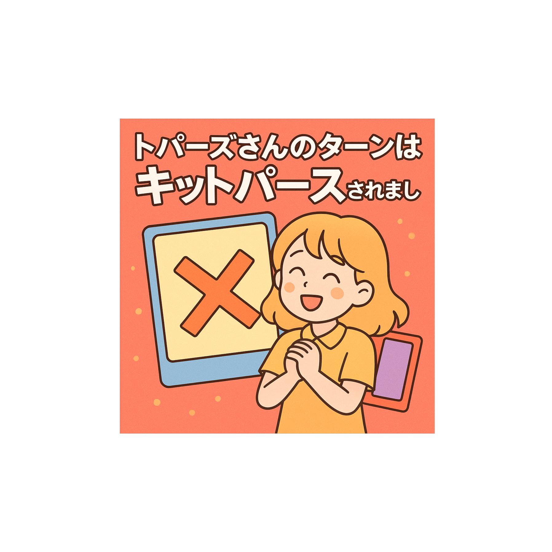 トパーズさんのターンはキットパースされました 歌詞欄(Lyrics)【Verse 1】 トパーズさんのターン 今かと待ってたのに カードがくるり回り あれ?飛ばされたんかい? 笑ってごまかしても 心はちょいブルーで 次こそ輝けると 信じてドローした --- 【Chorus】 キットパースされたけど まだ終わりじゃないさ ターンは巡るものよ きっとチャンス来るわ 光れトパーズさん スキップにも負けず リトライ! その笑顔で 場を照らすスター --- 【Verse 2】 テーブルの向こう側 勝ち誇るアメジスト 手札の影に隠す 秘策ひとつ温め 誰も知らないまま 静かに狙い定め ターンが回る瞬間 風が変わる予感 --- 【Chorus】 キットパースされたけど ドラマはここからよ 逆転の煌めきが トパーズ照らすのよ 笑顔を失わずに また立ち上がるのさ リセットじゃなく進化 ターンを超えて行け --- 【Bridge】 パスされた痛みも 今はスパイスみたい 次のプレイを彩る 経験値になる --- 【Final Chorus】 キットパースされたけど 夢はまだ続いてる ターンが巡るたびに 心が磨かれる 輝けトパーズさん パスされてもキット 次のターンこそは 勝利のカードを! |