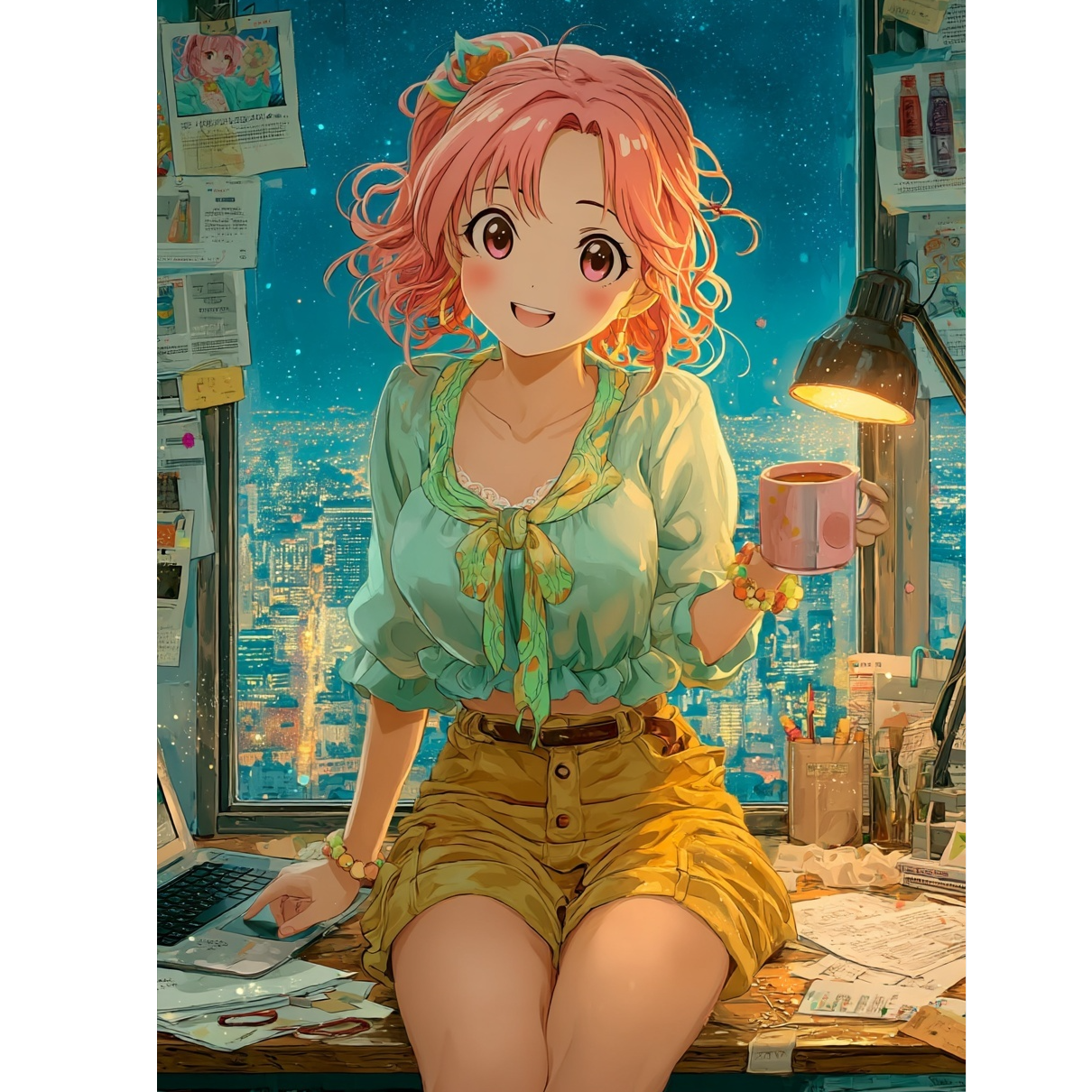 :Japanese idol pop × city pop × emotional night atmosphere. Title: “残業ミステリー〜なぜそんなにがんばれるの?〜” BPM118 / key D major / warm and catchy Japanese pop. Mood: gentle heartfelt a little mysterious but hopeful. Sound: electric piano soft pop drums muted guitar warm bass and dreamy synth bells. Add subtle SE like typing keys and ticking clock for night-office vibe. Keep tone soft and encouraging rather than dark. Intro: calm piano and whisper voice “あさが くるのに… ねぇ、なんで そんなに がんばれるの?” Verse1 (Amber): cozy rhythm describes late-night office light. PreChorus (Momone): emotional lift “まぐかっぷの なかの あわ” imagery admiration tone. Chorus① (All): warm harmonies soothing and sincere. Chorus② (All): brighter and poppier with claps and synth hits on “きゅん!ぱっ!しゅっ!” catchy and cheerful. Verse2 (Ruru): calm groove smooth bass and subtle sparkle. PreChorus2 (Vanilla): healing and emotional slow build. FinalChorus①: emotional idol harmony hopeful tone. FinalChorus②: full-band