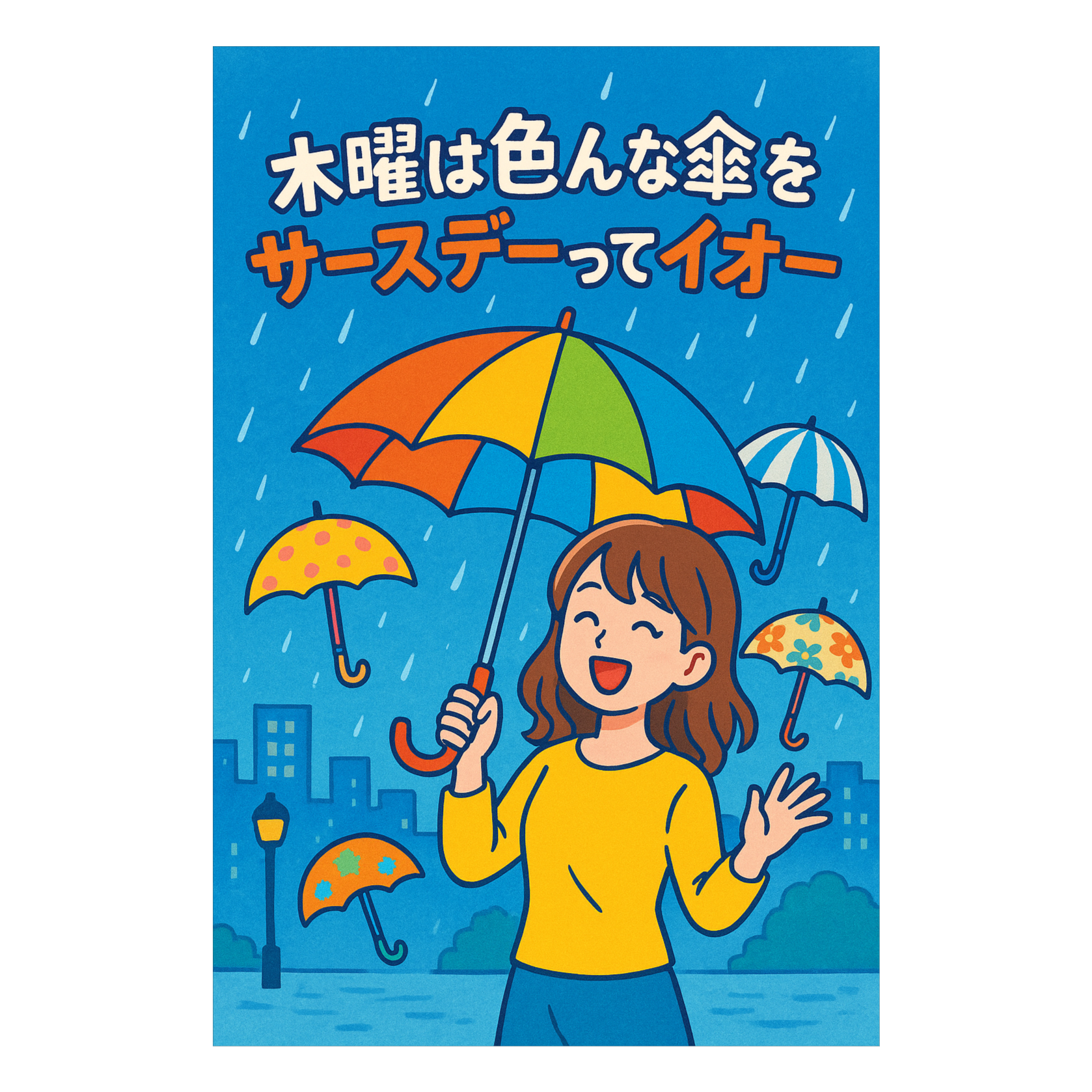 木曜は色んな傘をサースデーってイオー 歌詞欄(Lyrics)[Intro in humorous Kansai-style spoken tone] 「ほな木曜やし、派手な傘でもええやろ〜イオー!」 --- [Verse 1] 朝の空がちょい曇り でも気分は晴れや コンビニ前で迷う どの傘にしよかな 水玉・ストライプ・猫 みんな主役やで 今日のテーマは自由 雨上等サースデー! --- [Chorus] 木曜は色んな傘をサースデーってイオー 街がパレードみたいに きらめく午後や 木曜は雨もリズムにサースデーってイオー 跳ねる水しぶきまで メロディーになる! --- [Verse 2] 向かい風もええ感じ 髪が少し踊る 隣歩くあの子も 笑顔でイオーって言う 傘越しに覗いたら 光るしずくキラリ なんや今日は特別 心スキップサースデー! --- [Chorus] 木曜は色んな傘をサースデーってイオー 並ぶ影もカラフル まるでキャンバス 木曜は自由な空にサースデーってイオー 明日が晴れてもええ この瞬間がええ! --- [Bridge] 濡れたアスファルトが ミラーみたいに映す 傘の花が揺れる 七色のワルツ 誰もが主役やで イオーで始まる歌 雨の日こそ輝け! --- [Last Chorus] 木曜は色んな傘をサースデーってイオー 回せ回せ世界中で イオー!イオー! 木曜は奇跡の雨でサースデーってイオー 笑顔の虹がかかる イオー!サースデー! --- [Outro spoken tone] 「よっしゃ、次は日曜も傘持ってこか〜イオー!」 |