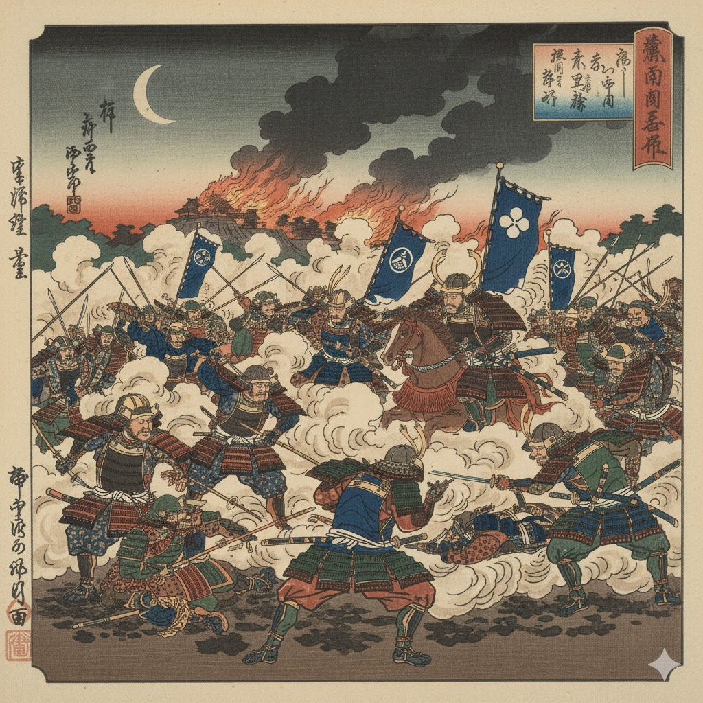 :Create a high-energy battle track at BPM 160 Intense Japanese traditional instrumental track dark eerie haunted urgent Features koto (fast sharp plucks) biwa (aggressive strums) shakuhachi (haunting sliding melodies) Okedo-daiko (driving accents) kagura bells (piercing punctuations) Arrangement: call-and-response battles between koto and biwa layered rhythmic ostinatos shakuhachi weaving urgent lines through drum hits instruments dueling and competing Texture: tight energetic percussive attacks overlapping rhythms relentless suspense