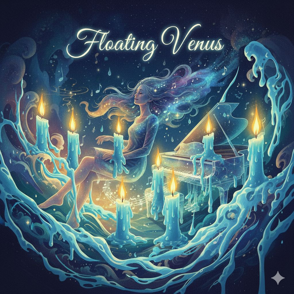 :Jazzy Deep House Ambient Ballad.Tempo 60bpm Key Dm7.4/4 slow deep house pulse.Chord:Dm7-G13-Cmaj7-A7sus4. Instrumentation/Vibe: Acoustic piano plays soft jazzy chords syncopated rhythm floating arpeggios(reverb/delay).Deep sub bass smooth 4/4 lines.Modular synth pads create ambient psychedelic textures chiming tones(heavy reverb/delay/slow filter sweeps).Organic percussion has soft brushed drums timpani hits.Field recordings:ambient rain/wind/night nature sounds(intro/outro).Electric guitar plays sparse dreamy fragments(multi-tap delay/reverb). Vocals: Soft airy female vocal(lush reverb/delay) occasionally whispering intimate floating feeling slow-paced delivery. Structure: Intro(Synth pad rain piano fade in).Verses(Vocals piano bass brushes).Choruses(Full synth layers thicken).Bridge(Dominant electric guitar psychedelic solo filtered synth swells rhythm loosens).Outro(Gradual fade wind/rain return vocal whispers dissolve).