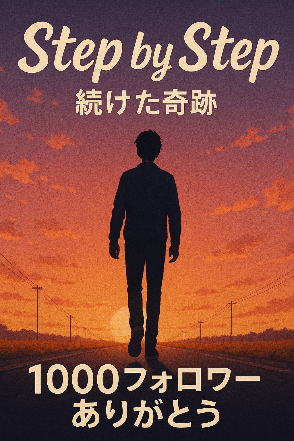 :A mixed Japanese-English inspirational pop rock track. Uplifting and heartfelt tone with a light acoustic band arrangement and steady pop-rock beat. Lyrics alternate between English and Japanese lines expressing themes of perseverance growth and deep gratitude for followers. Emphasize the emotional support received through every “like” “follow” and comment and how those interactions gave strength to keep going. Include well-known motivational phrases such as “Fall seven times stand up eight” and “Rome wasn’t built in a day ” paired respectfully with Japanese proverbs like 「七転び八起き」and 「継続は力なり」. Include a catchy and rhyming chorus centered around the phrase “Step by step” and “ありがとう”. BPM: around 105 Key: C emotional and warm mood.
