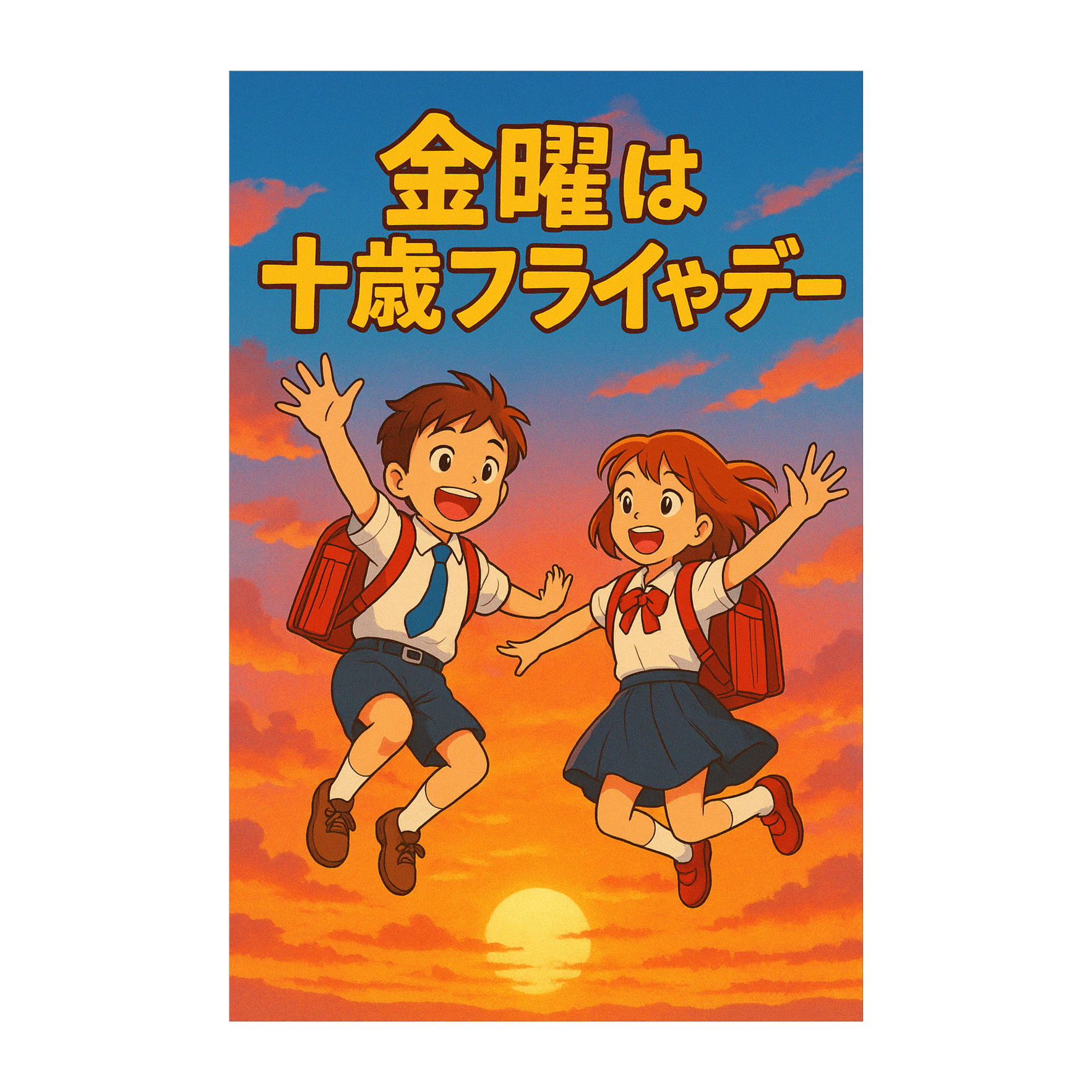 金曜は十歳フライやデー 歌詞欄(Lyrics)[Intro] 十歳フライ!フライ! 金曜ジャンプ!ハイ! [Verse 1] 宿題なんて置いといて 放課後パーティー始まって ランドセルより軽い夢 空に投げて フライアウェイ! [Pre-Chorus] 靴ひも結び直して 時計も止まるトキメキ [Chorus] 金曜は十歳フライやデー! カレンダーも飛び越えて 笑い声が羽ばたいて 青春(はる)を追い越すスカイブルー! [Verse 2] 給食の味まだ残って アイスの棒で占いして 明日が休みって魔法やね 心の風船ふくらませ! [Pre-Chorus] ランドセルの中には 未来の地図がかくれんぼ [Chorus] 金曜は十歳フライやデー! カレンダーも飛び越えて 笑い声が羽ばたいて 青春(はる)を追い越すスカイブルー! [Bridge] 夕焼けに背伸びして 手のひらに星つかむ 「まだ帰りたくないな」って 風に叫ぶ [Final Chorus] 金曜は十歳フライやデー! 夢のボタン弾け飛んで 週末なんて序章やね 明日もきっとフライやデー! [Outro] 十歳フライ!フライ! 金曜ジャンプ!ハイ! |