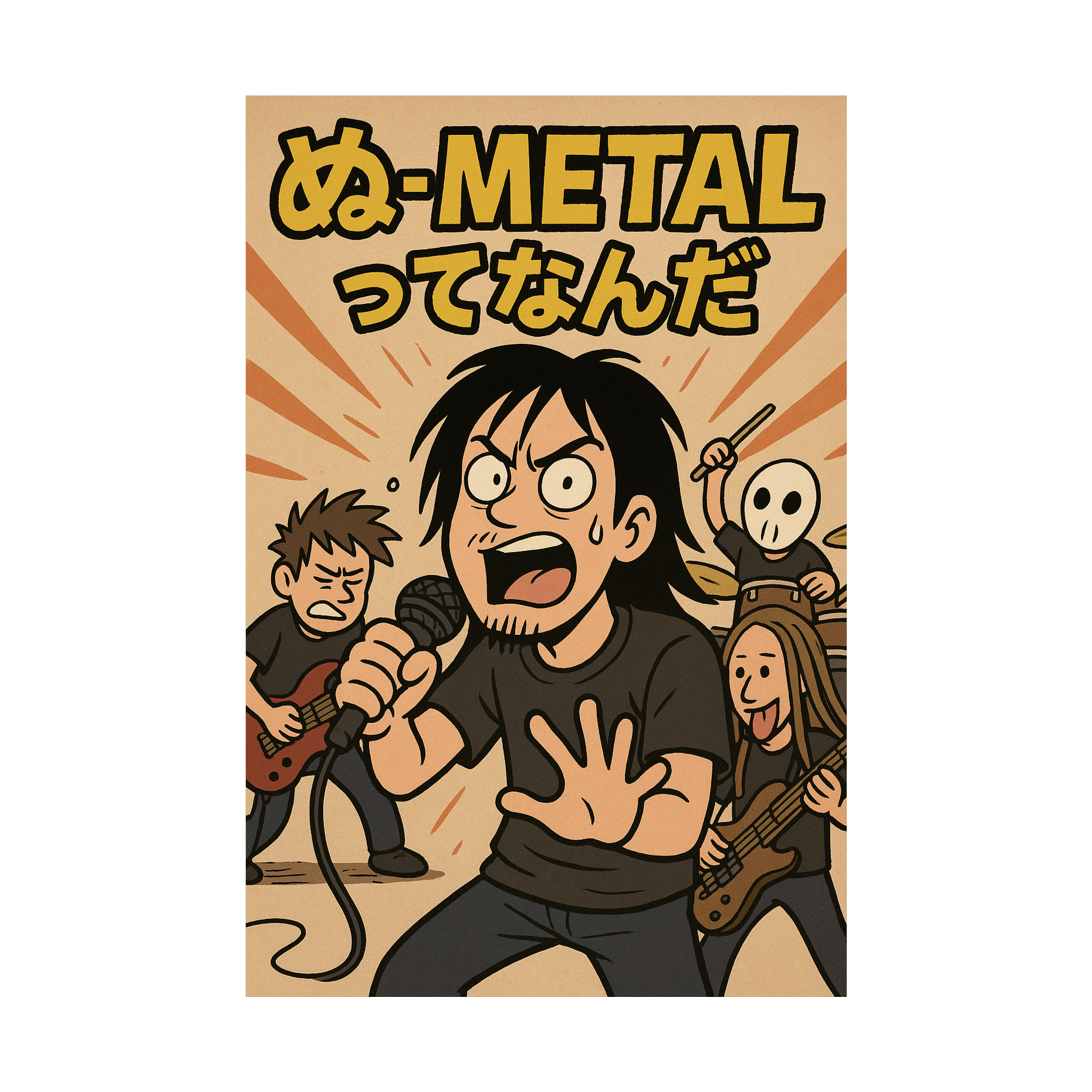 ぬ-Metalってなんだ? 歌詞欄(Lyrics)Yeah…! ぬぬぬぬぬー! ぬぬぬぬぬっ!と始まるぜ! Are you ready!? ぬ-METAL!! [Verse1] ぬ-Metalってなんだ? ぬ-Metalってなんなんだ? ぬめるMetalのことなのか Oily Slipy ぬるぬるしているMetal 掴もうとしたら手が滑る ぬるぬるMetal 掴みどころが難しい ぬめったMetal この手から滑って落ちる **ぬるぬる ぬるぬる** ぬるぬる Yeah! [Verse2] ぬ-Metalってなんだ? ぬるいMetalのことなのか? Slightly warm Lukewarm ほんのりひとはだ温度のMetal 日本酒温めるにはちょうどいい ぬくといMetal こころがほんわか ひとはだMetal やさしい温度 **もっと ぬるく ぬるく** ぬるめて Yeah! [solo] [Verse3] ぬ-Metalってなんだ? 縫うMetalのことなのか? sew stitch hand sewing needle お気にのデニムも縫って修復 縫合完了、ステッチが光る 縫うMetal ワンポイントデコレイト 繕うMetal パッチワークもお手の物 **ぬって ぬって こころをこめて** ぬいぬい ぬうぬう Yeah! [Verse4] ぬ-Metalってなんだ? 脱ぐMetalのことなのか? remove undress strip off ぜんぶ脱ぎ捨て まっぱのMetal 熱い魂を風にさらしてCool Down 脱ぐMetal 開放感に身を任せ 脱衣Metal 全てを解き放て **ぬぎ ぬぎ 全てをぬいで** 裸のままで 大きく叫べ! [Bridge] ぬるくて、ぬめって、縫い合わされて、脱いでいく それでも鳴らし続ける 俺たちのMetal 冷たくない 熱くもない ちょうどいい温度のカオス! [Final Chorus] ぬ-Metalってなんだ? **答えはまだない** ぬ-Metalってなんなんだ? **掴めそうで掴めない** それが俺たちのぬ-Metal 叫べ! 叫べ! Everybody say ぬー! **ぬぬぬぬー! ぬーMetal!!** ぬ-Metal! ぬーぬーぬー! **ぬぬぬぬー! ぬーMetal!!** ぬ-Metal! |