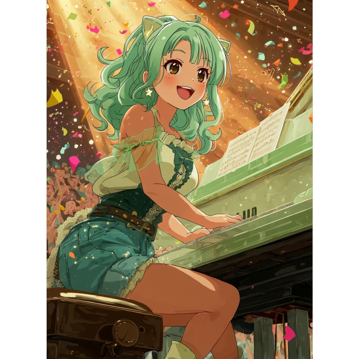 :Upbeat Elton John-style piano rock J-POP idol song with a retro 70’s flair. Driving rhythmic piano chords live acoustic drums with handclaps playful bassline and bright electric guitar accents. Cheerful five-member Japanese idol group vocals with clear expressive tone and tight harmonies. Each member alternates solo lines with distinct personalities: - Mint: fresh and energetic - Vanilla: soft and healing - Momone: bright and lively - Amber: sweet and playful - Ruru: cool and confident The arrangement features lively piano-driven verses and a double-stage chorus: First chorus is bright and melodic; Second chorus becomes faster and playful with rapid “nyan nyan” refrains channeling classic rock energy and audience participation. Bridge introduces a heartfelt message: “Like a cat it’s enough just to be here you don’t need to try too hard.” Overall mood: joyful nostalgic and heartwarming — a retro piano rock anthem
