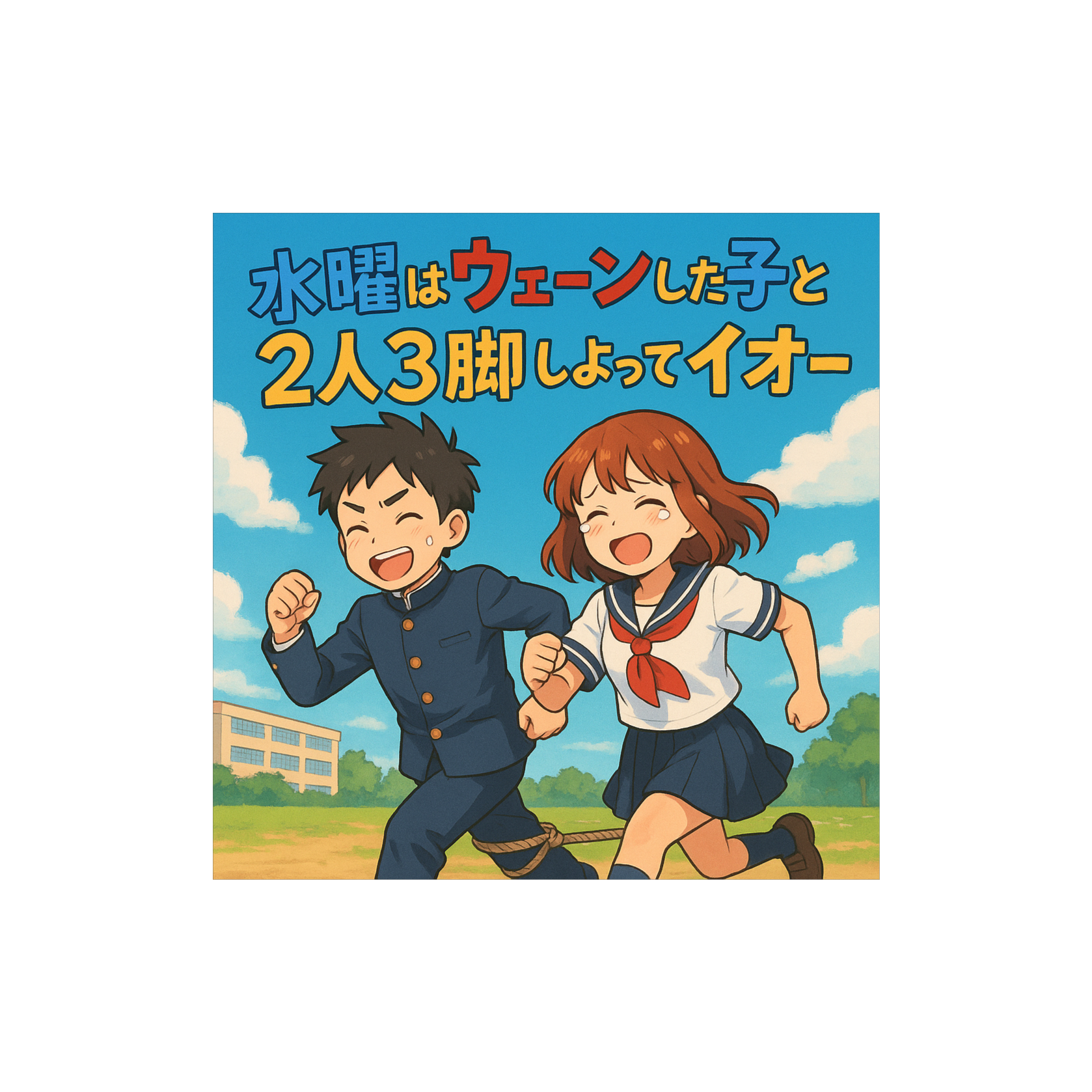 水曜はウェーンした子と2人3脚しよってイオー 歌詞欄(Lyrics)[Intro] イオー! 風が泣いても イオー! 笑って走ろう! --- [Verse 1] 放課後のグラウンドで 君がうつむいたまま 涙ひと粒転がり 泥に小さな虹が出た --- [Pre-Chorus] 泣くのは恥じゃないで そのままの顔でええ 右足と左足で 世界をちょっと踏み出そか --- [Chorus] 水曜はウェーンした子と 2人3脚しよってイオー! 転んでもまた笑いながら 前向いて走ろってイオー! --- [Verse 2] 汗と涙が混じって 靴もびしょぬれやけど 君の手がぎゅっと強く 「もう大丈夫」って言うた --- [Pre-Chorus] ひとりやった昨日より ふたりの今日がええな 結んだひもがほどけても 心はもうほどけへんで --- [Chorus] 水曜はウェーンした子と 2人3脚しよってイオー! 泣き虫でも一等賞や 夢まで一緒に行こってイオー! --- [Bridge] ゴールの向こう 夕焼けが まぶしゅうて泣き笑いや 明日また泣いたらええ また一緒に走ればええ --- [Final Chorus] 水曜はウェーンした子と 2人3脚しよってイオー! 涙も笑顔もリレーして 未来を越えていこってイオー! --- [Outro] イオー! 泣いた数だけ イオー! 絆が光るで! |