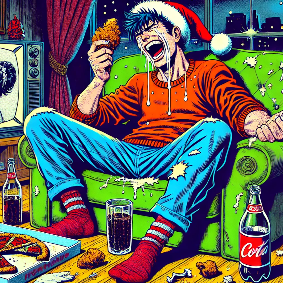 :A high-energy and funny Japanese Christmas-themed rock song mixing the styles of Chonoryoku Senshi Dorian . It features a fast-paced punk rock beat (like two-beat drumming) and heavy guitar riffs combined with a catchy synthesizer melody. Crucially a bright cheerful and relentless Jingle Bells sound (sleigh bells) must be added. This sound should play in stark contrast to the aggressive rock instruments creating an ironic and comical mismatch that emphasizes the song's theme. The song structure must include intense call-and-response sections where the audience can shout back simple words or sing along loudly. The lyrics are comical and relatable (specifically relating to the feelings around Christmas)